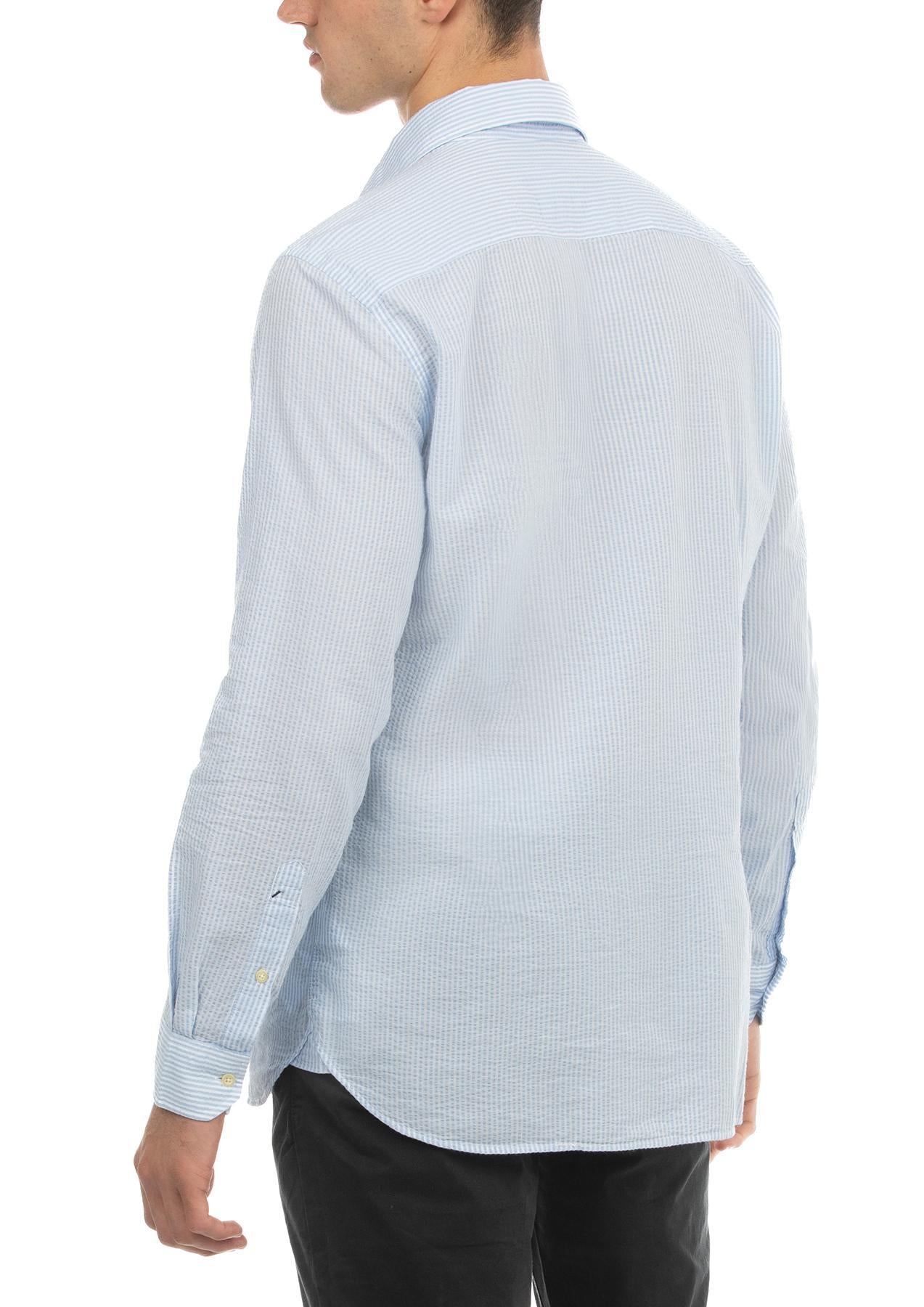 Experience the perfect fusion of modern fit and classic craftsmanship in our Striped Seersucker Collar Shirt. Designed in Florence, this lightweight shirt combines the airy, textured quality of seersucker with a tailored spread collar—a timeless piece for any wardrobe.